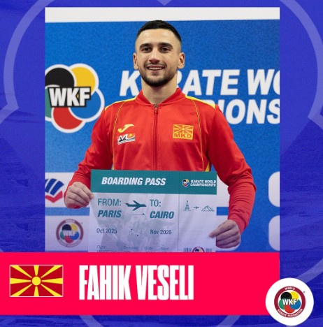 Карате федерацијата на РС Македонија со голема гордост информира дека нашиот репрезентативец Фаик Весели обезбеди пласман на квалификацискиот турнир што се одржа во Париз во периодот од 17 до 19 октомври 2025 година за учество на Светското сениорско првенство, кое ќе се одржи во Каиро, Египет.